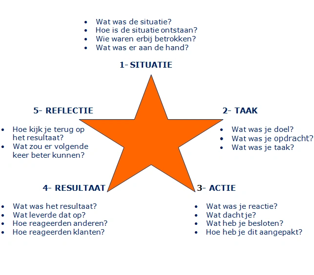Maar waar staat STAR(R) voor? STAR(R) staat voor Situatie, Taak, Actie, Resultaat en Reflectie. Hieronder is een korte uitleg te vinden van alle fases in het gesprek: